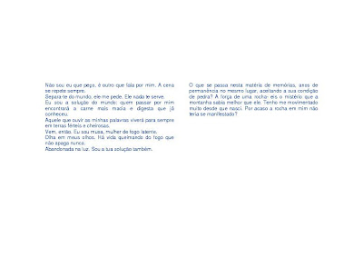 Meu essencial é a minha interioridade, vontade de inverno, recolhimento. O difícil do que é... quando está acontecendo não sabemos da sua presença, apenas sabemos que está acontecendo... depois paramos na saudade eterna... nada se encaixa no lugar. Um ser humano de ritualismos e de delicadezas com o ser. Eu opto por tudo que for para nos distanciar, para nos levar a um estado não comum, a uma perda da capacidade de negar ou afirmar... vem que eu te mostro como podemos viver um instante este silêncio da linguagem, é muito rápido, repentino e altamente perigoso. Uma pequena habitação, um pouso intranqüilo e absolutamente ensurdecedor. Quem soube visitar nunca mais será o mesmo. No olhar carrega um ângulo a mais, uma passagem para o extremo oposto, um ombro deslocado, uma aparência de clareza e carrega um peito absolutamente aberto.